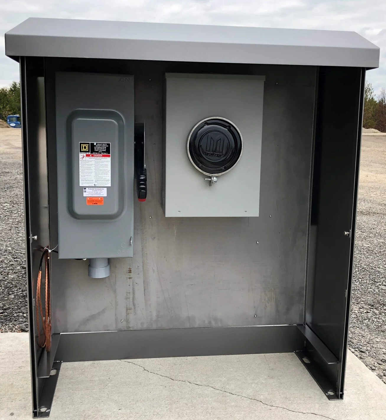 Dual sided lockable enclosure, with centre partition. Allows this side to be locked, and maintained by the local hydro authority. Also allows having both metered and un-metered power feeds in the same conduit.