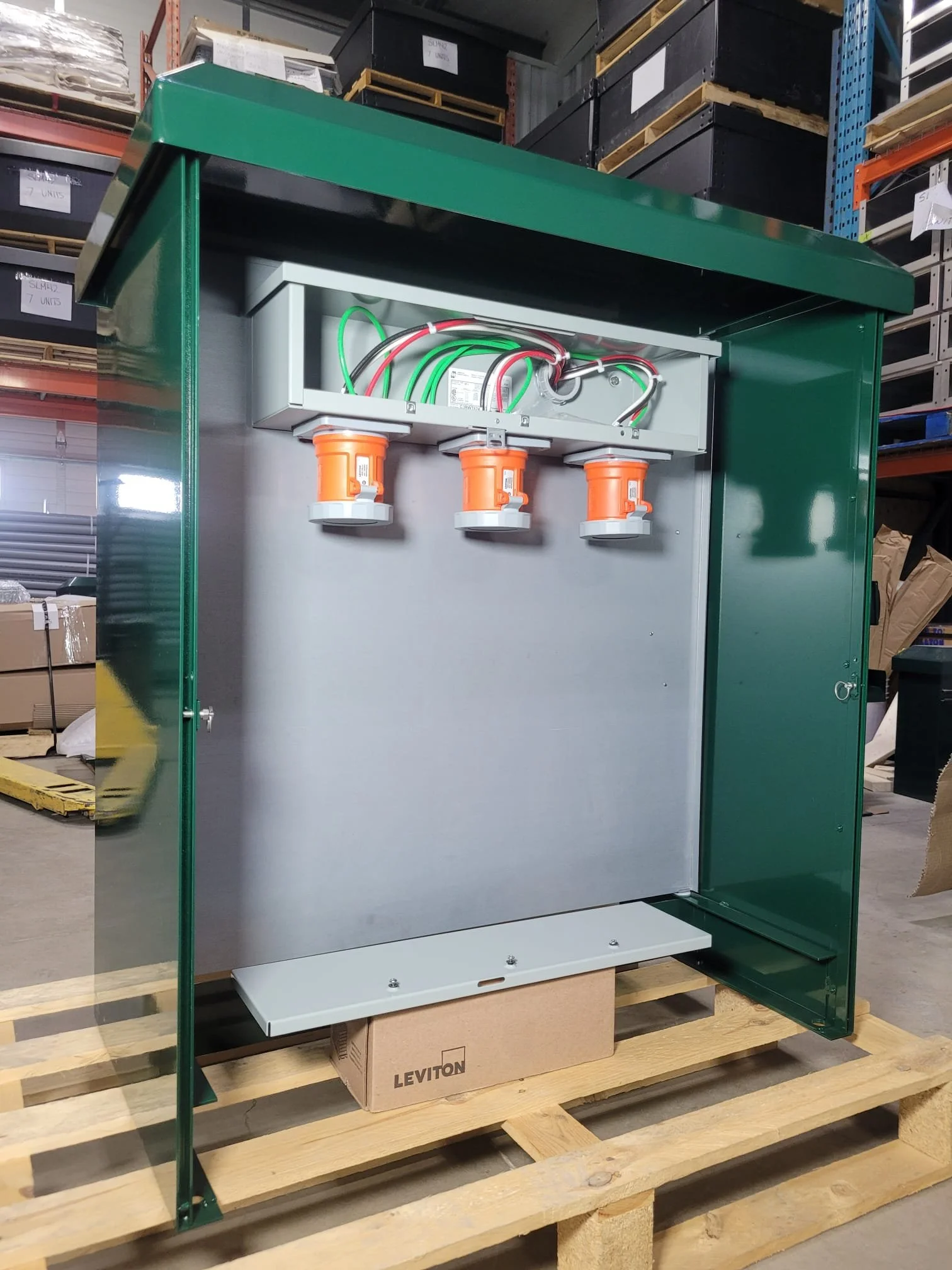 Houses a 200amp Service Panel with 40 circuits. We also added in a temporary use receptacle as well for the client as well.